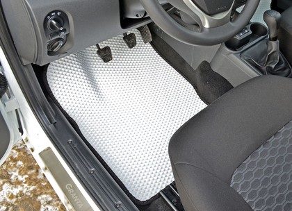 Автоковрики ЕВА не впитывают, а удерживают грязь в ячейках. Вода не катается по полу, как в резиновых половичках, однако, её все равно видно. ЕВА удобны тем, что их легко достать не пролив и вытряхнуть. Они дешевле.